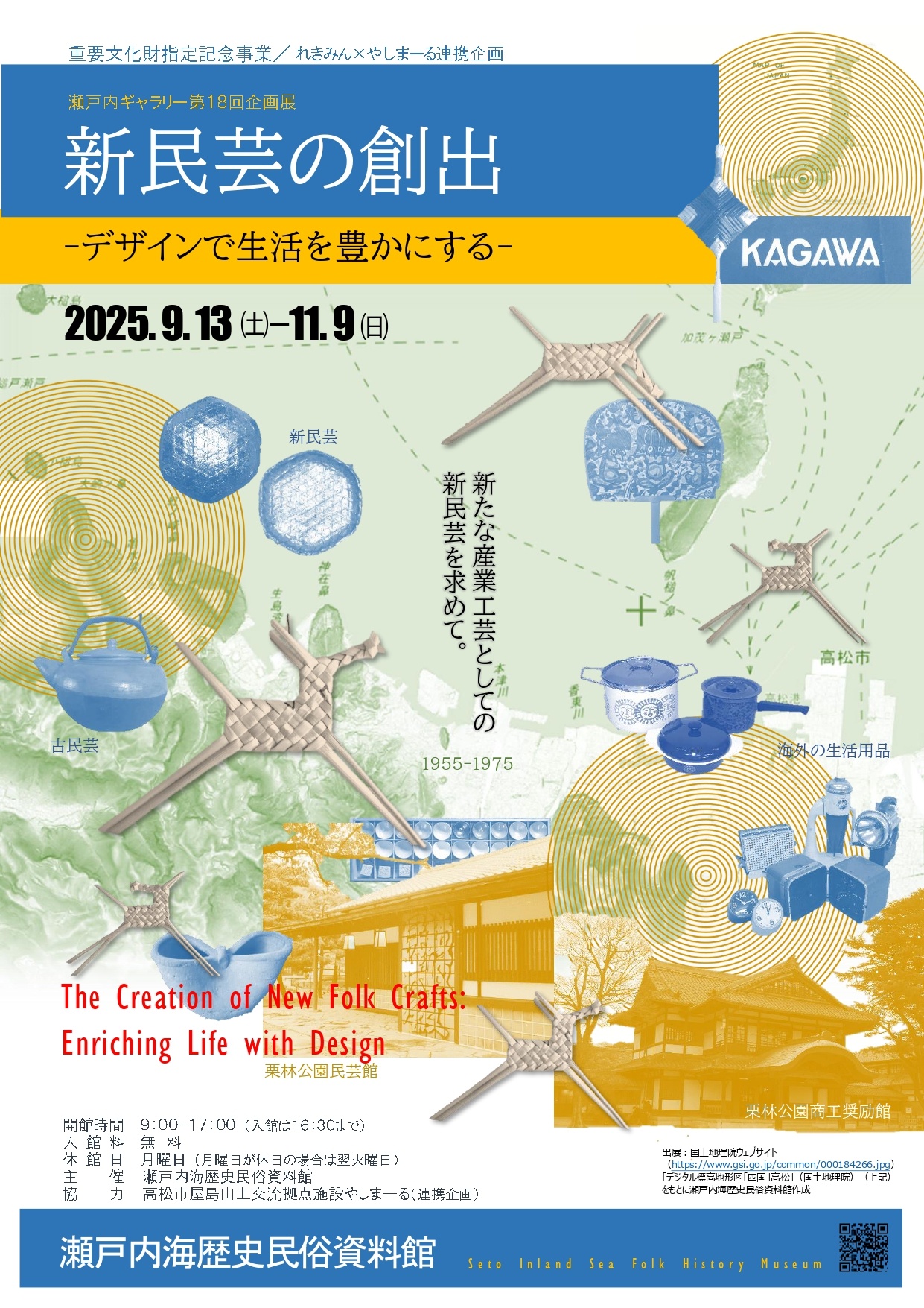瀬戸内海歴史民俗資料館が開館した昭和40年代、香川のデザイン運動は多方面に展開していました。本展では、民俗資料館の視点から、地場の民芸(古民芸)や海外の生活用品に学び、風土に根ざした素材、技術をいかして取り組まれた香川県の新民芸創出の活動を紹介します。また、伝統的なくらしの道具の転換点とも重なる大阪万博前後の大きな変化のなか、デザインで生活を豊かにしようとした香川県内の取り組みに注目し紹介します。