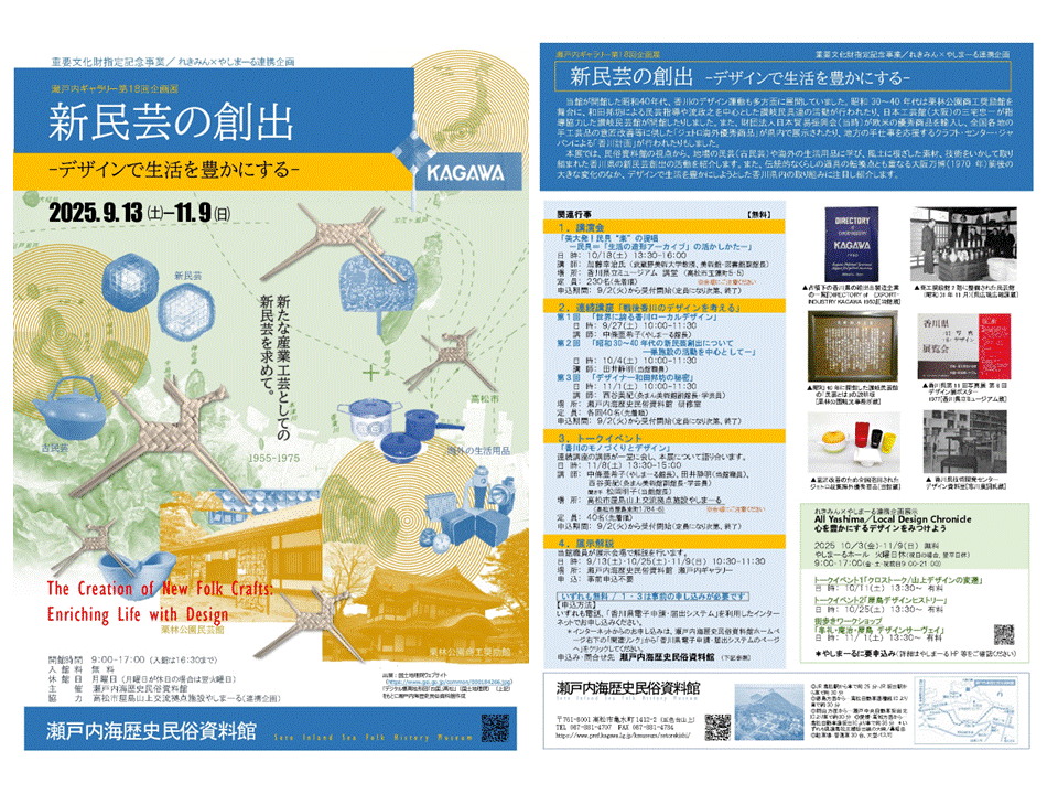 2025年11月8日、瀬戸内海歴史民俗資料館(れきみん)の企画展「新民芸の創出 -デザインで生活を豊かにする-」の関連イベントに当館学芸員が参加しました。会場は、屋島の山頂にある“やしまーる”。前回、担当した講座は五色台の“れきみん”だったので山から山へのイベントでした。連続講座を担当した3人の講師とれきみんの館長が登壇。予定では、連続講座のダイジェストをそれぞれ15分でプレゼンしてからディスカッションでしたが、ほとんど振り返りの時間でした(苦笑)私はトリだったので時計とにらめっこ、焦りました~…。ただ会場が変わると参加者の顔ぶれも違い、とても新鮮な時間を過ごすことができました。会場からは的確な質問もあって有難かったです。
