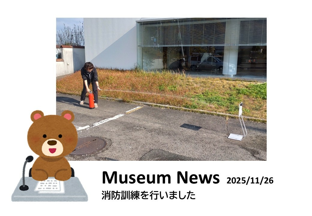 本日(2025年11月26日)毎年恒例の消防訓練を行いました。小さな美術館ですが避難経路や消火器の場所を確認しました。また、検査担当者の方から誰もが使用できるように「消火器」のラベルを掲示するように指導もいただきました。屋外での消火訓練では、火災現場から3メートルくらい離れて消化を開始すること、ホースは上下ではなく横に振りながら撒くこと、もし火の手が高さ2~3メートルにあがったら徹底しましょう、などいつも以上に丁寧に解説していただきました。人災と天災は紙一重。できる対策はすべて行って万が一に備えたいと思います。