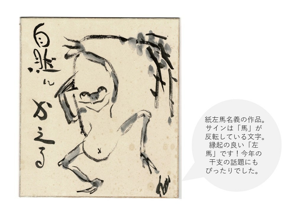 今回は三浦邦輔/紙左馬旧蔵資料の旧所蔵者のご家族にも遠路はるばる参加いただいました。和田邦坊の弟子・三浦邦輔(以下、邦輔)のお孫さんにあたる方です。美術館としてはいつも以上に賑わった日にご来館いただけて良かったです(笑)!展示の感想を聞いてみると「親族にはあまり会社員タイプはいません。モノづくり、デザインなどのクリエーター系が多くて。祖父の歴史をみると血は争えないなと思いました」と笑っていました。また「むかし祖父が住んでいた家の記憶もありますが、なんとなく和田邦坊さんの作品に通じる雰囲気がありました。影響受けていたのだと分かりました」というお話もありました。確かに、今回の展示でも師匠である邦坊の作品を真似て描いたカエルの色紙絵があります。間違いなく作風にも画題にも影響を受けていたはずですが、他の資料(アルバム)をみると根っから人を楽しませることが好き、オシャレ好き、ひょうきんでチャーミングな人柄など趣味も思考も似た者同士だったように感じます。そうでなければ、へんこつな邦坊と一つ屋根で暮らせるはずがない…!(邦輔は師匠宅で約5年間同居していました)。