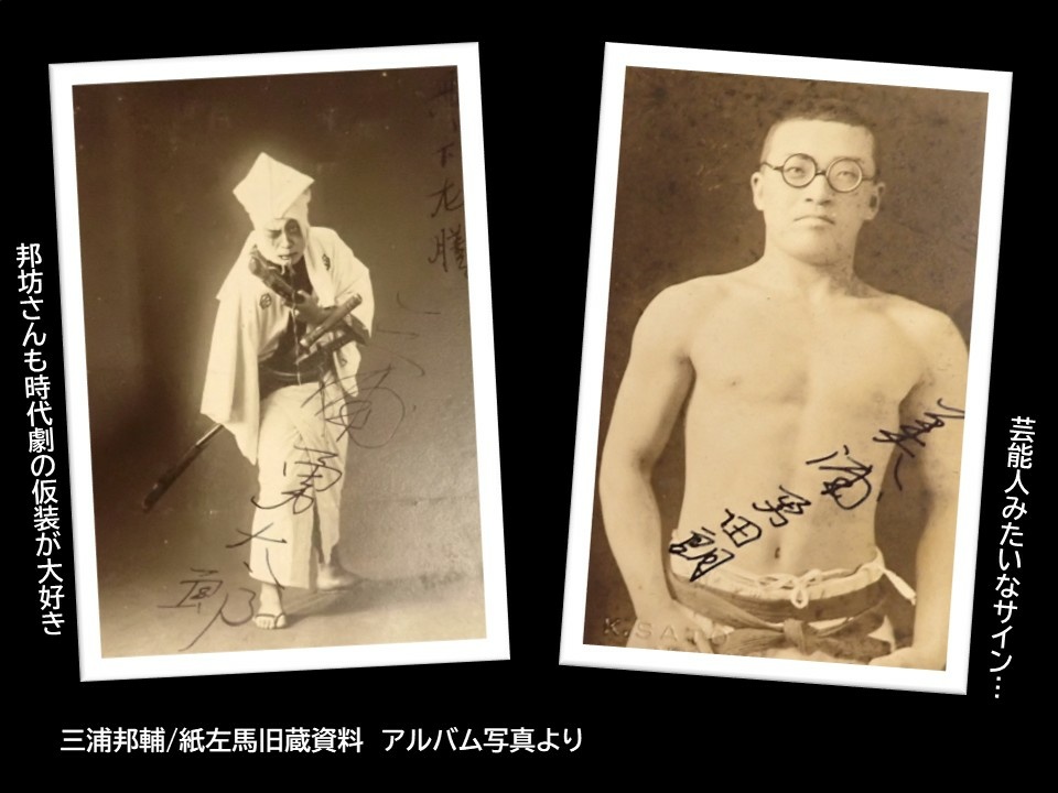 ちなみに師弟でも全く違う一面もあります。それは、運動ができるかどうかです。師匠の邦坊は体も弱く運動は苦手そう。ストレスで睡眠障害にも悩み、晩年まで健康に対して苦労した人でした。一方、邦輔は水泳、相撲などスポーツ万能。様々な大会にも出場し、高校の時は川でおぼれている人を救助したという記録も残されています。アルバムをめくると美しい肉体美を披露したカッコいい写真も数多くありました。今回は寄贈記念としてのミニコーナーでしたが、あらためて人としても魅力的な三浦邦輔特集をしてみたいと思いました。いろいろもう少しスクラップブックの記事など読み進めながら資料整理をしてまいります、どうぞご期待ください~。