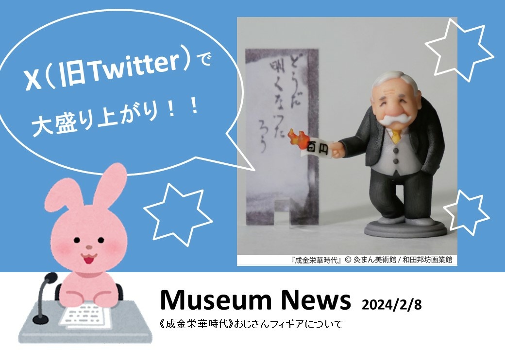 ありがたいことに美術館にもフィギアのお問い合わせがたくさん届いていますが、まったく準備できていおらず在庫完売となっております。ただいま発注していますがどうやら販売元にも100件以上も予約が殺到しているようです。つきまして美術館の入荷日も未定となります。大変申し訳ありません。フィギアとともに新商品(アクリルスタンド)も登場予定です。3月になりますが成金おじさんのピンバッチも納品されます。おじさんフィギアとともにどうぞご期待ください。