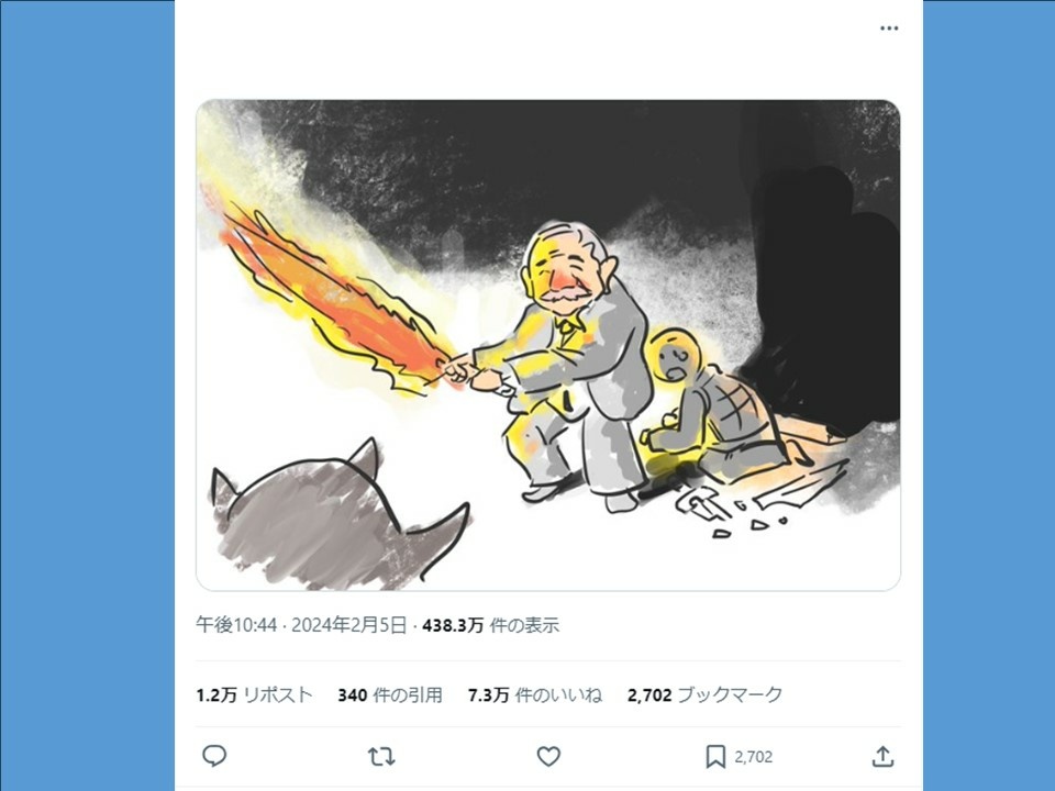 美術館は、成金おじさんのファンアート(非営利の二次創作)を密かに応援しています。今回の話題で見つけた作品もひとつご紹介。(作者の方に掲載OKをいただきました)お金を燃やすというとんでもないおじさんだったはずなのに、なんと炎のソードを持った戦士として描かれています。原案と変わらないニコニコ笑顔が妙にいい感じ。よくみるとソードの持ち手は紙幣のような…ついつい細かく観察してしまいます(笑)X(旧Twitter)では、イラストからセリフやシチュエーションがポストされており壮大な物語が展開されていました。個人的に「心(かね)を燃やせ…!」の台詞がツボにはまりました。あの漫画の有名なセリフ!(^^)まとめサイトでは「未来を明るくするヒーロー」と紹介されていました。これだけでも頬が緩みます…フフフ。なんて平和な成金栄華時代の世界!邦坊画伯も想像していなかった展開だと思います。