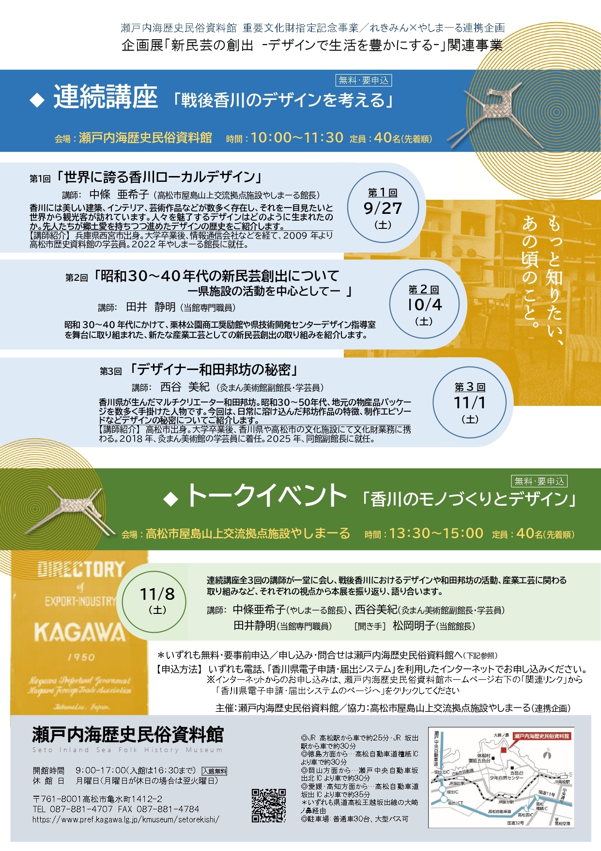 瀬戸内海歴史民俗資料館の企画展「新民芸の創出 -デザインで生活を豊かにする-」関連イベントとして連続講座を担当した講師たちによるトークイベントが開催されます。当館学芸員も講師のひとりとして登壇します。講座で話せなかったこと、研究の展望・課題、講師同士の質疑応答などなど。れきみんの田井さんともやしまーるの中條さんとも頻繁に会う仲ではないので、とても貴重な?3ショットになると思います。次の会場は、五色台ではなく屋島の「やしまーる」です、どうぞお間違いなく。山から山へのイベントが続きますが、楽しみですね!また、新しい視点・出会いに恵まれますように。頑張ります~えいえいお~!