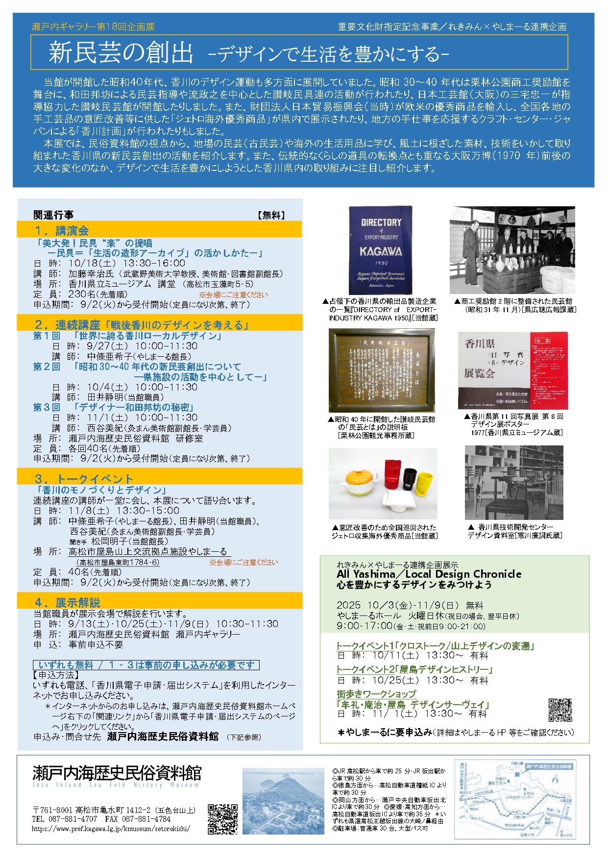 瀬戸内海歴史民俗資料館が開館した昭和40年代、香川のデザイン運動は多方面に展開していました。本展では、民俗資料館の視点から、地場の民芸(古民芸)や海外の生活用品に学び、風土に根ざした素材、技術をいかして取り組まれた香川県の新民芸創出の活動を紹介します。また、伝統的なくらしの道具の転換点とも重なる大阪万博前後の大きな変化のなか、デザインで生活を豊かにしようとした香川県内の取り組みに注目し紹介します。
