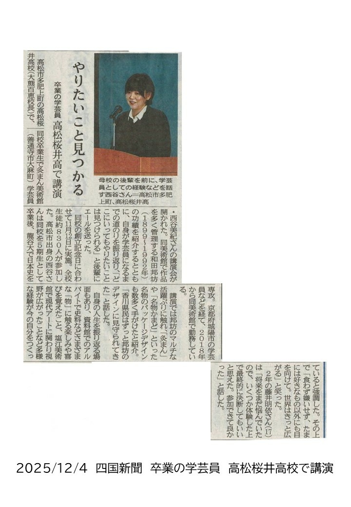 2025/12/04 四国新聞 卒業の学芸員 高松桜井高校で講演