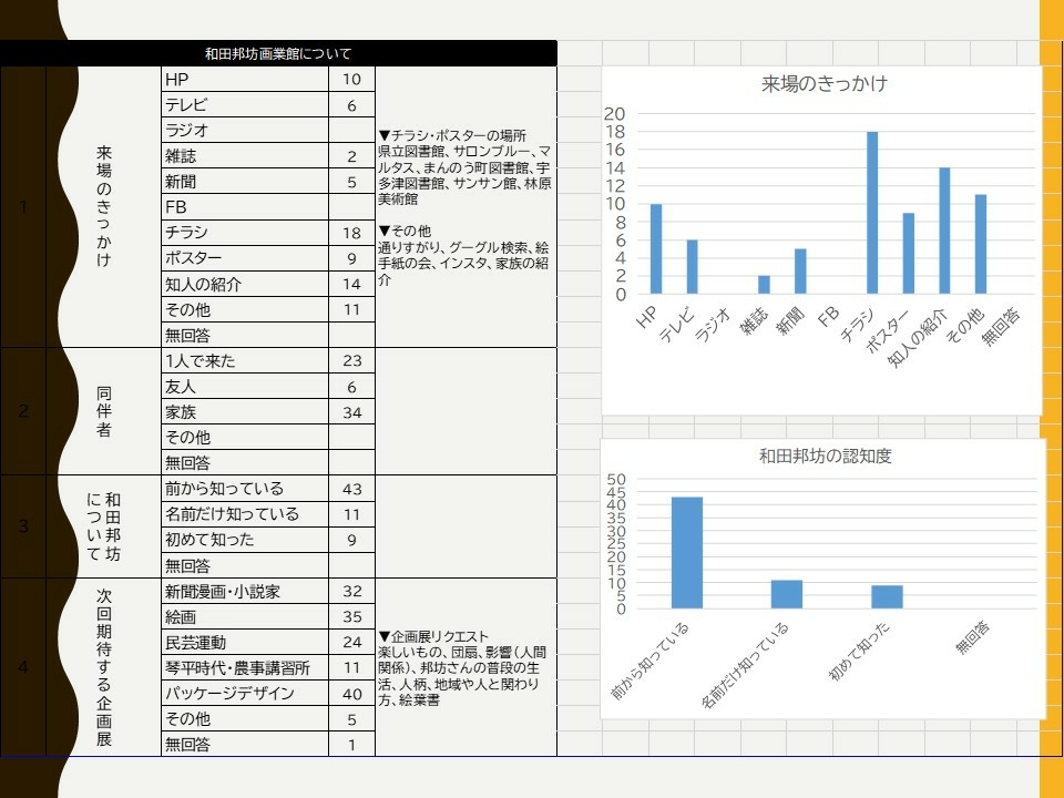 13. 夫婦できました。小さい頃から当たり前に見ていたいろいろなデザインが邦坊さんのものだと知りました。驚くほど生活のあらゆる部分で見ていたので自分の生活の一部になっていることが嬉しかったです。フランス人の夫と来ましたが、ダイナミックなデザインにとても圧倒されていました。