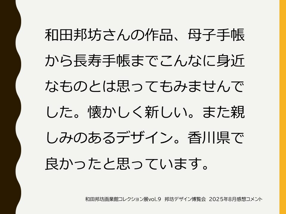 29. 小さい頃からお土産やお供えでいただいて、いつも家のどこかであった見覚えのある包装紙・紙袋。よく行っていた山田家うどん、、、そして母子手帳の鳥のデザイン。どれも懐かしく今もなお側にあり感動しました。香川のスターですね。また展覧会をしてください。よろしくお願いします。小・高校の大先輩というのも驚きです。