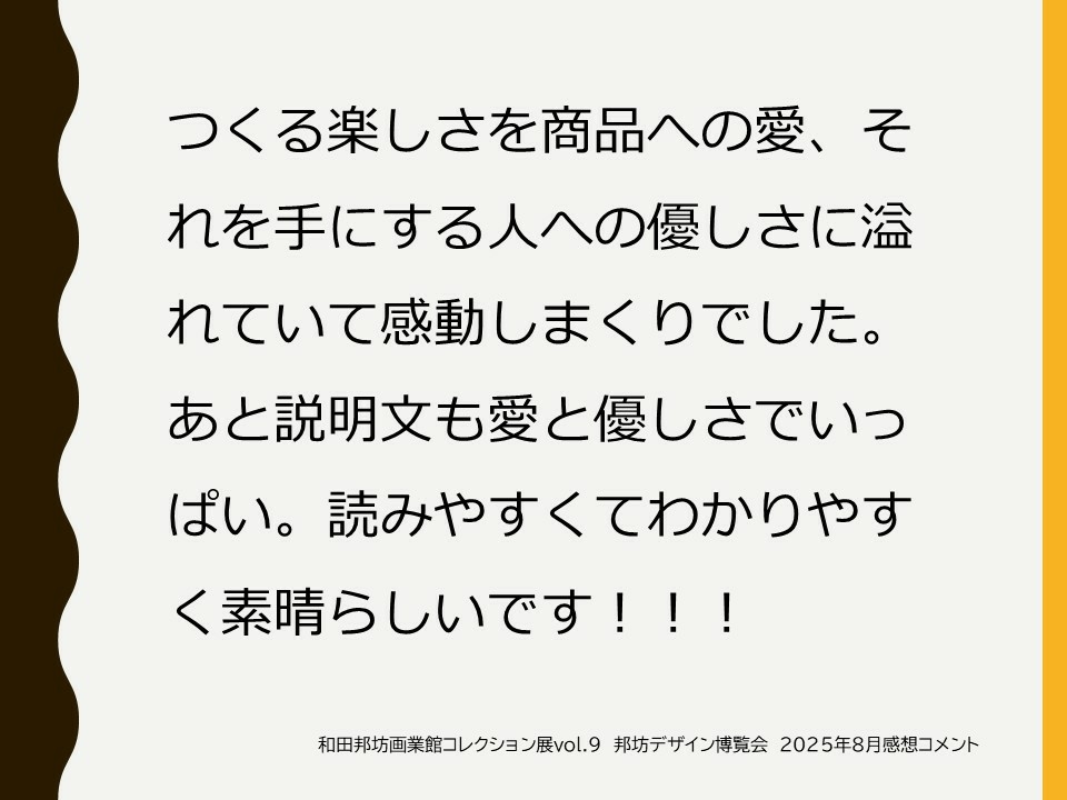 42. 邦坊さんのデザインがとても好きなので展示をみていて幸せな気持ちになりました。とても楽しい展示でした。次回の展示も楽しみにしています。いつも素敵な展示をありがとうございます!