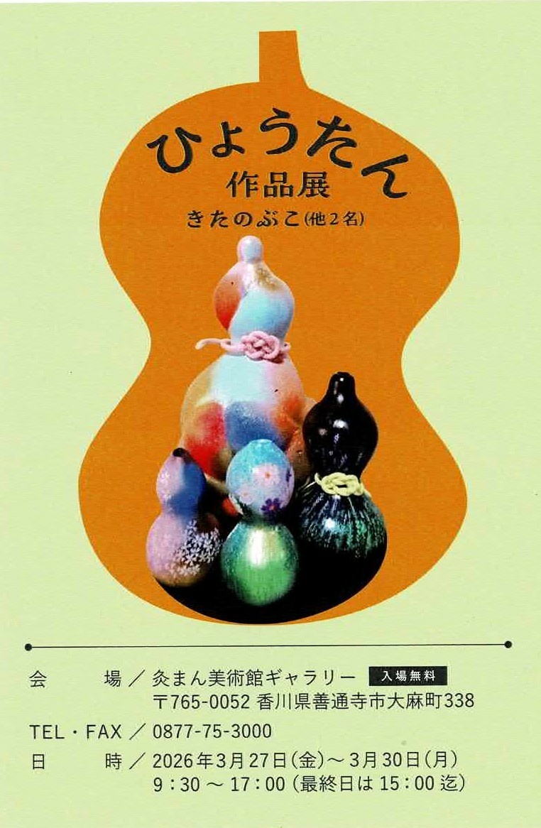作家・木田信子(綾川町)の個展。様々なアート経験を経てゼロから創作活動を開始。瓢箪に草花を描いたアート作品、瓢箪をモチーフにした切り絵、アクリル画、陶芸作品、ハンドメイド雑貨など約40点を展示。