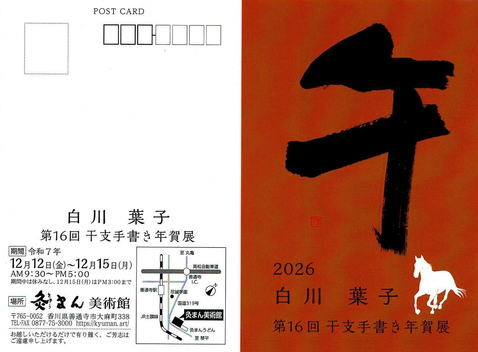 年賀状作家・白川葉子(観音寺市)の個展。手書きの年賀状、色紙、凧など約550点を展示。来年の干支の作品も登場します。