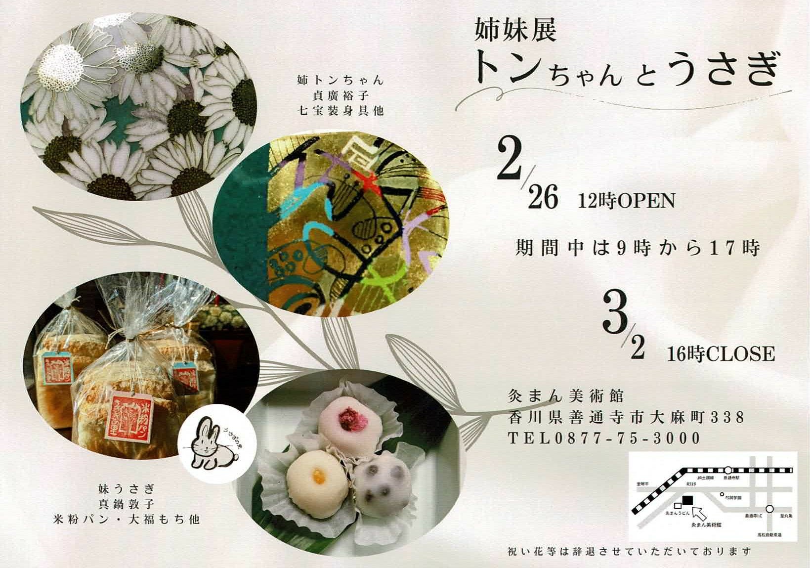 モノづくり姉妹による展示即売会。姉トンちゃん(工芸作家・貞廣裕子)は七宝装身具を展示販売。妹うさぎ(真鍋敦子)は米粉パン・大福もちを販売します。